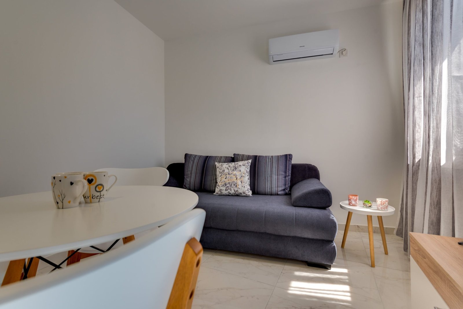 One-bedroom apartment located on the ground floor, consists of living room with sofa bed and 1 double bedroom, a bathroom with shower, equipped kitchen and covered patio with sitting area – swimming pool and sea view.