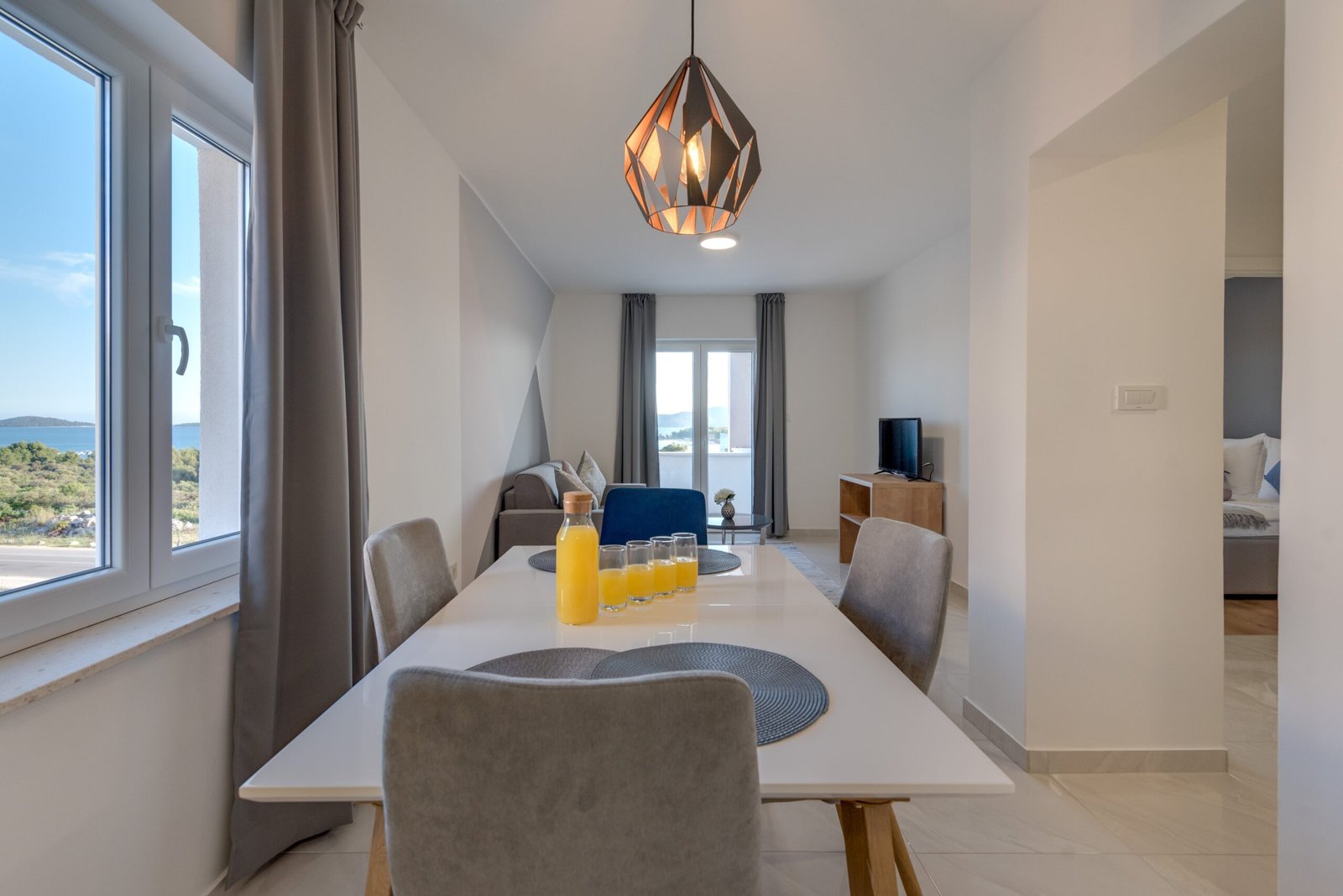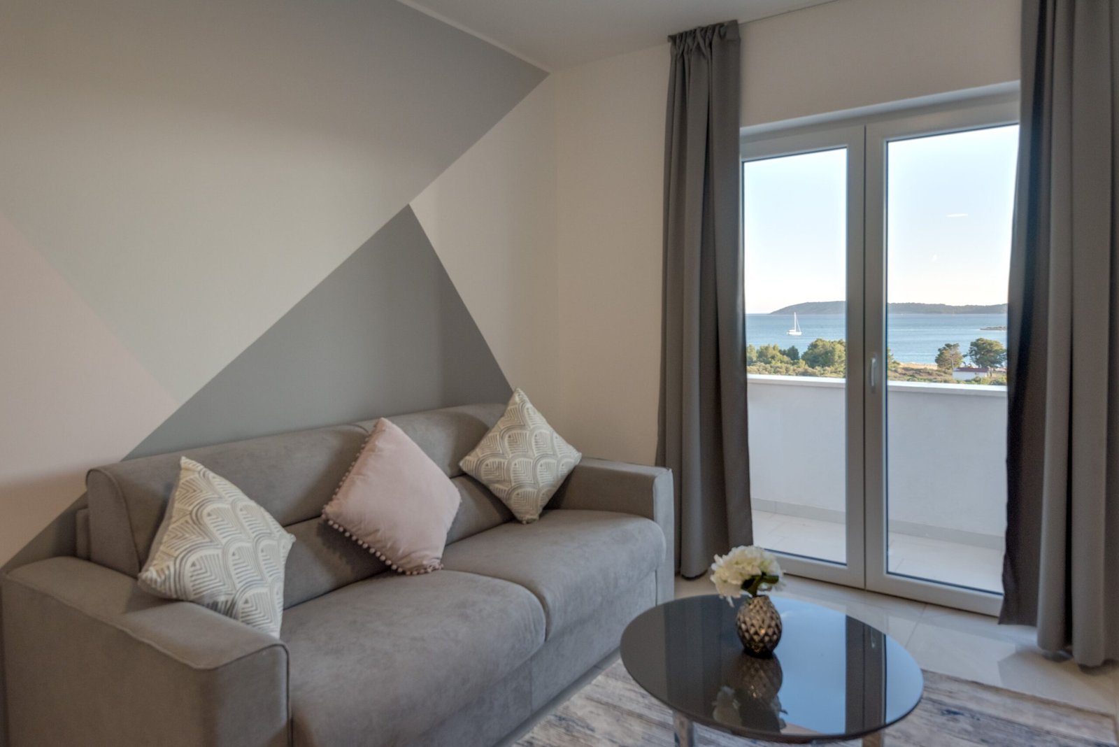One-bedroom apartment located on the first floor, consists of: living room with sofa bed, one bedroom with double bed, a bathroom with shower, equipped kitchen and covered terrace with sitting area and sea view.