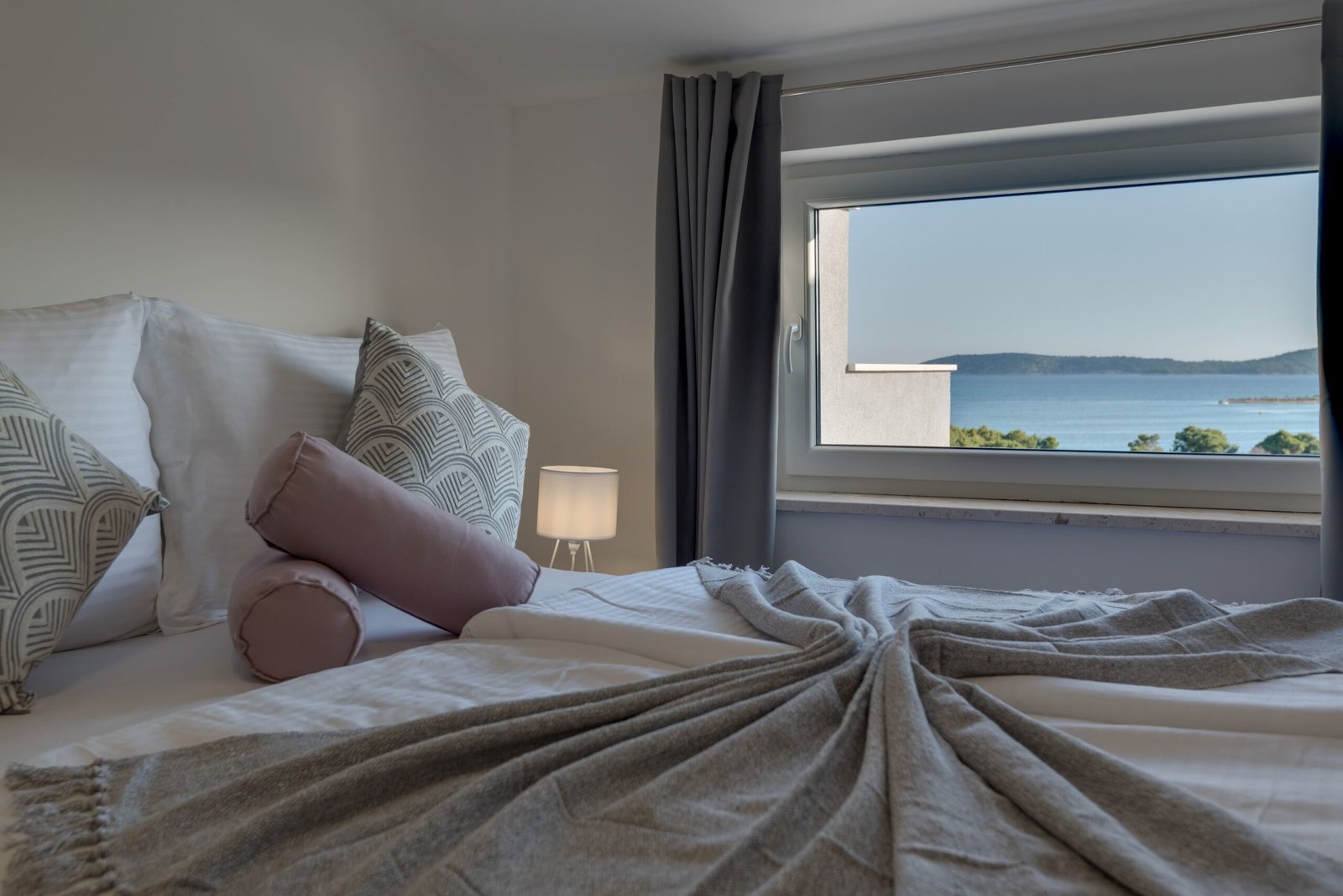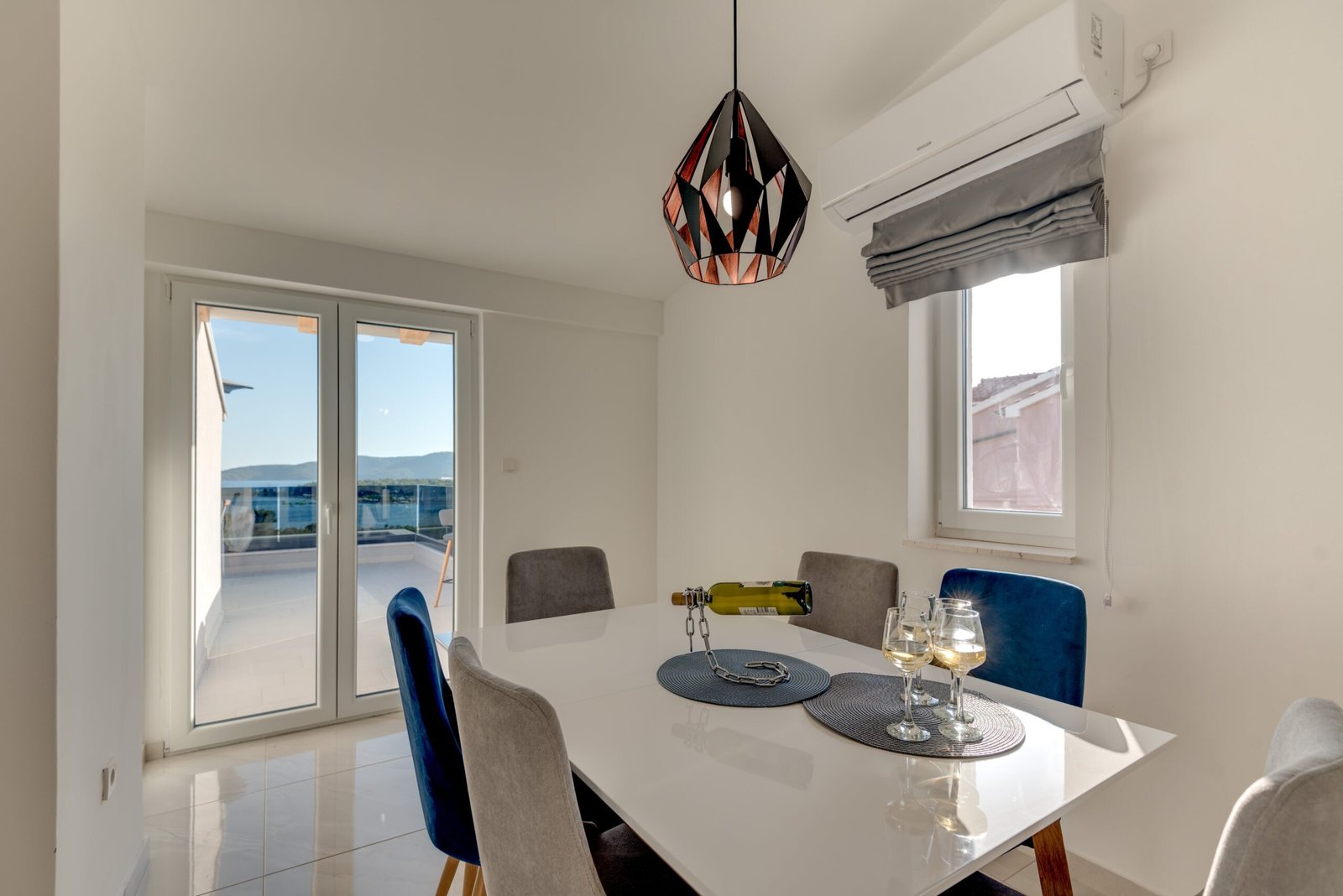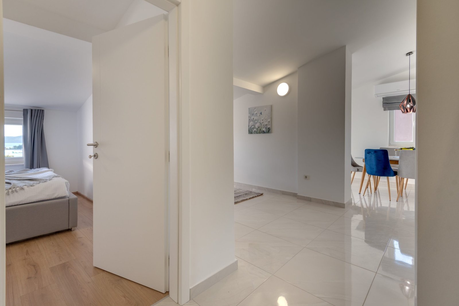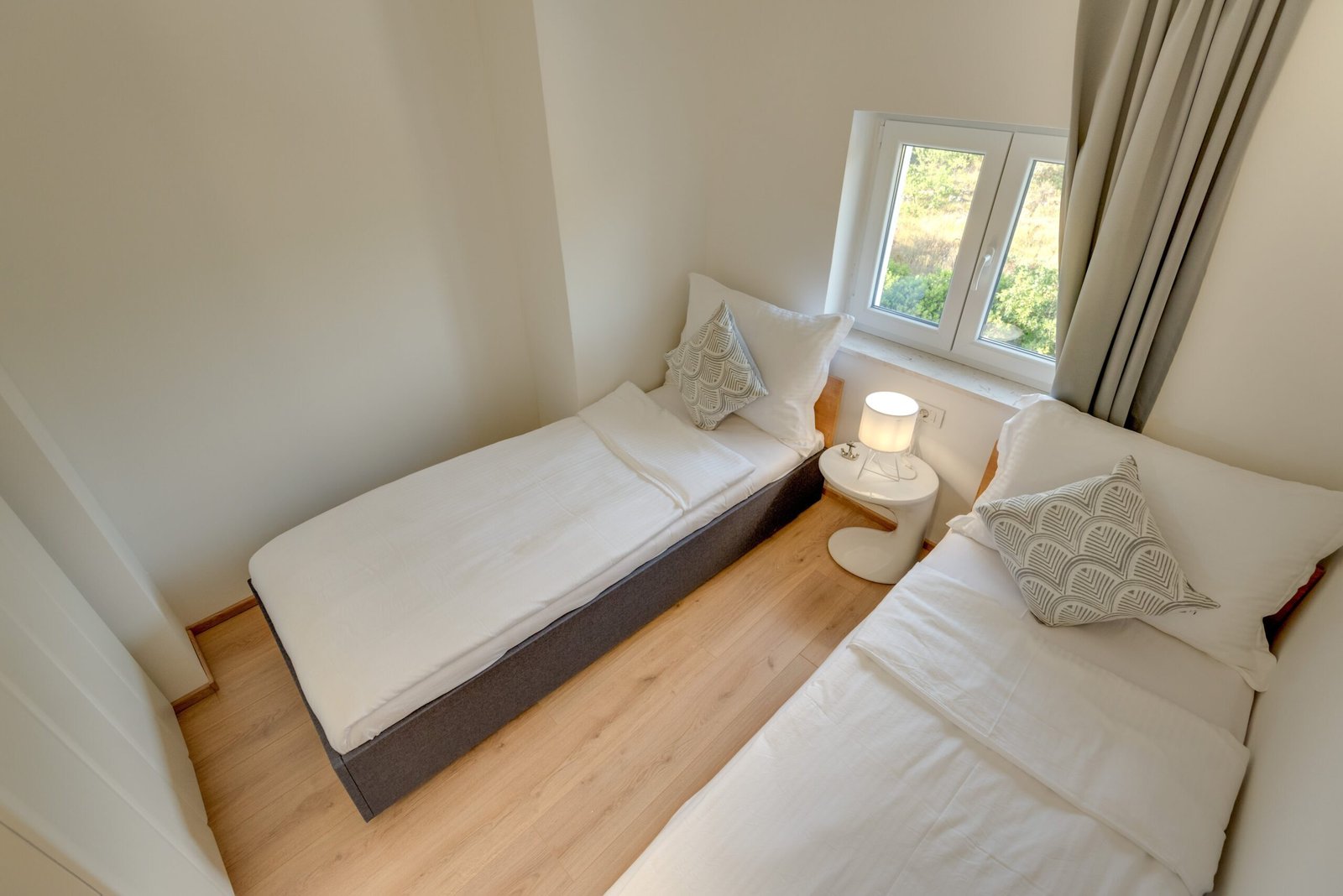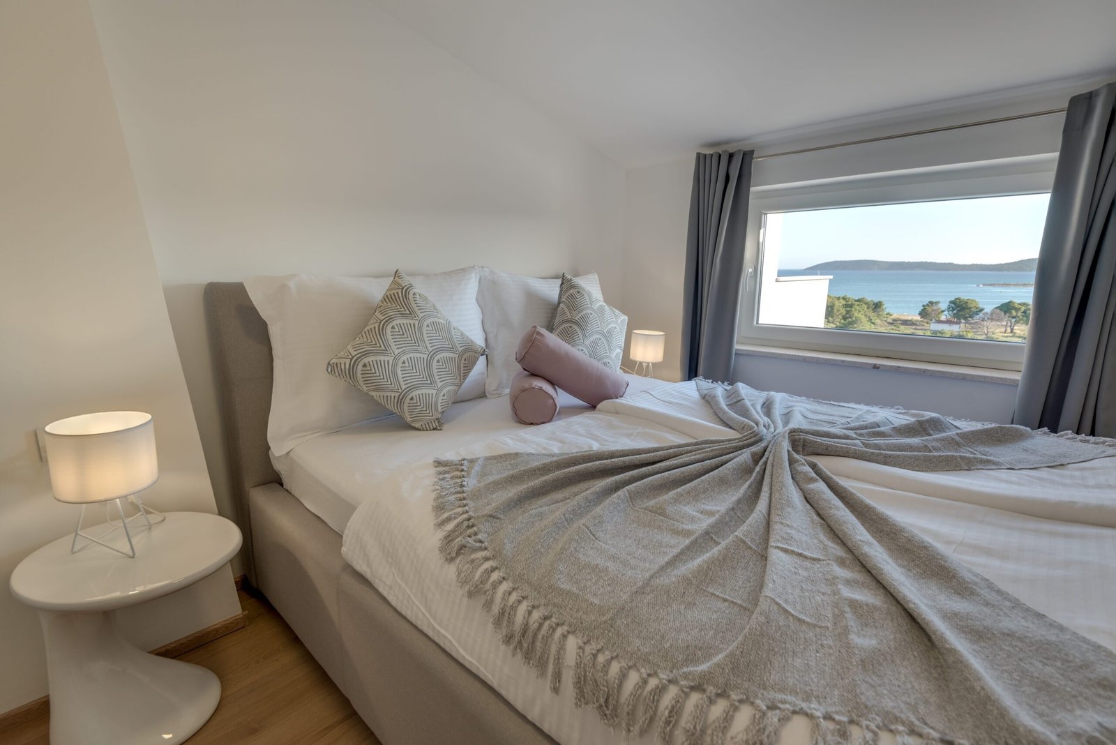 Two-bedroom apartment located on the second floor, consists of: living room with sofa bed, one bedroom with double bed, second bedroom with two single beds, a bathroom with shower, equipped kitchen and terrace with sitting area and sea view.