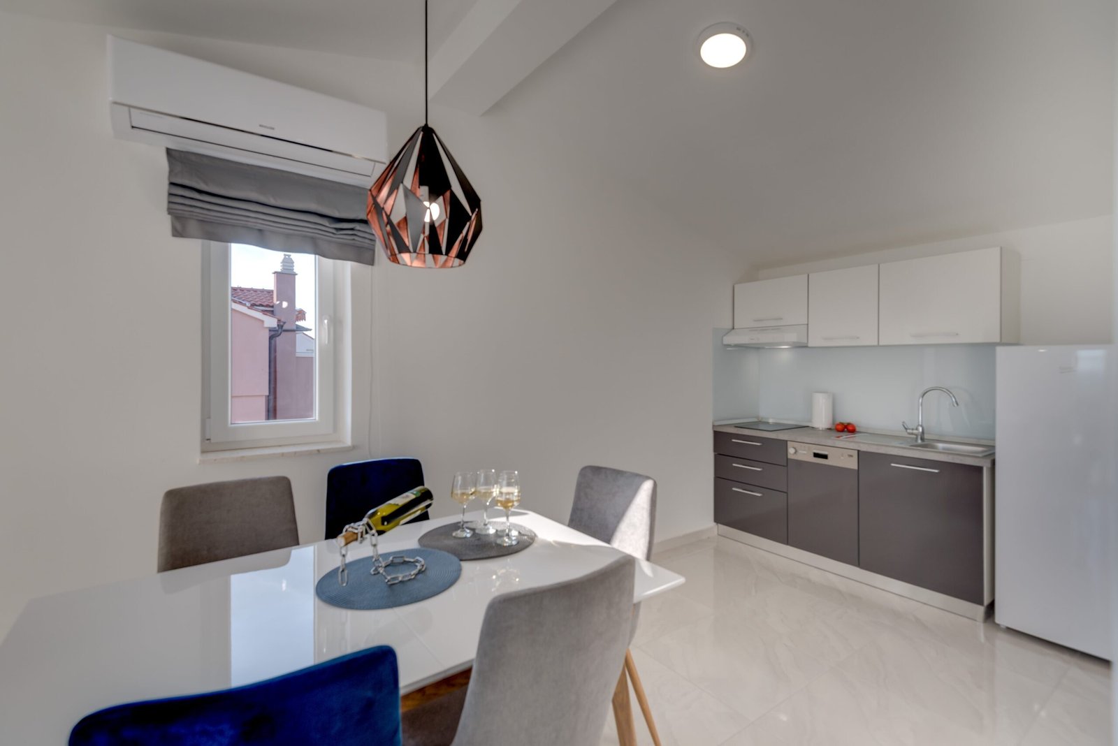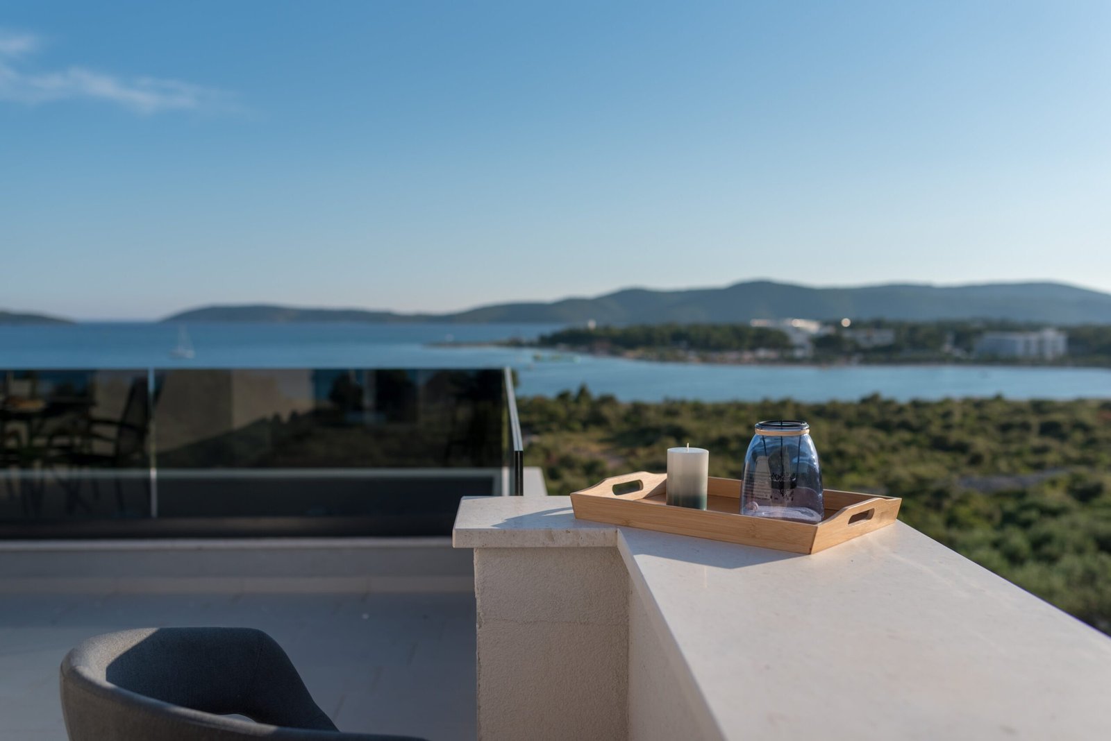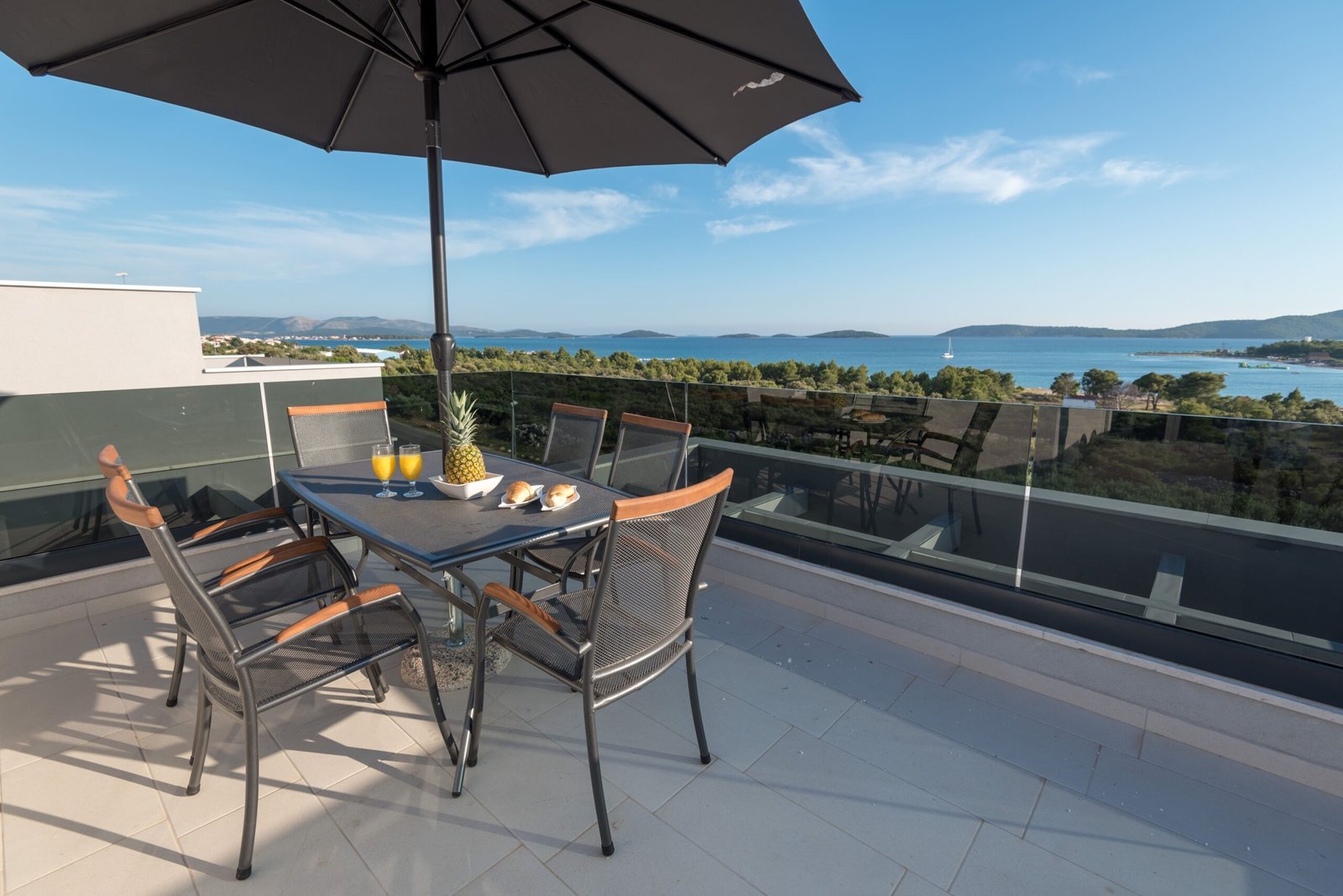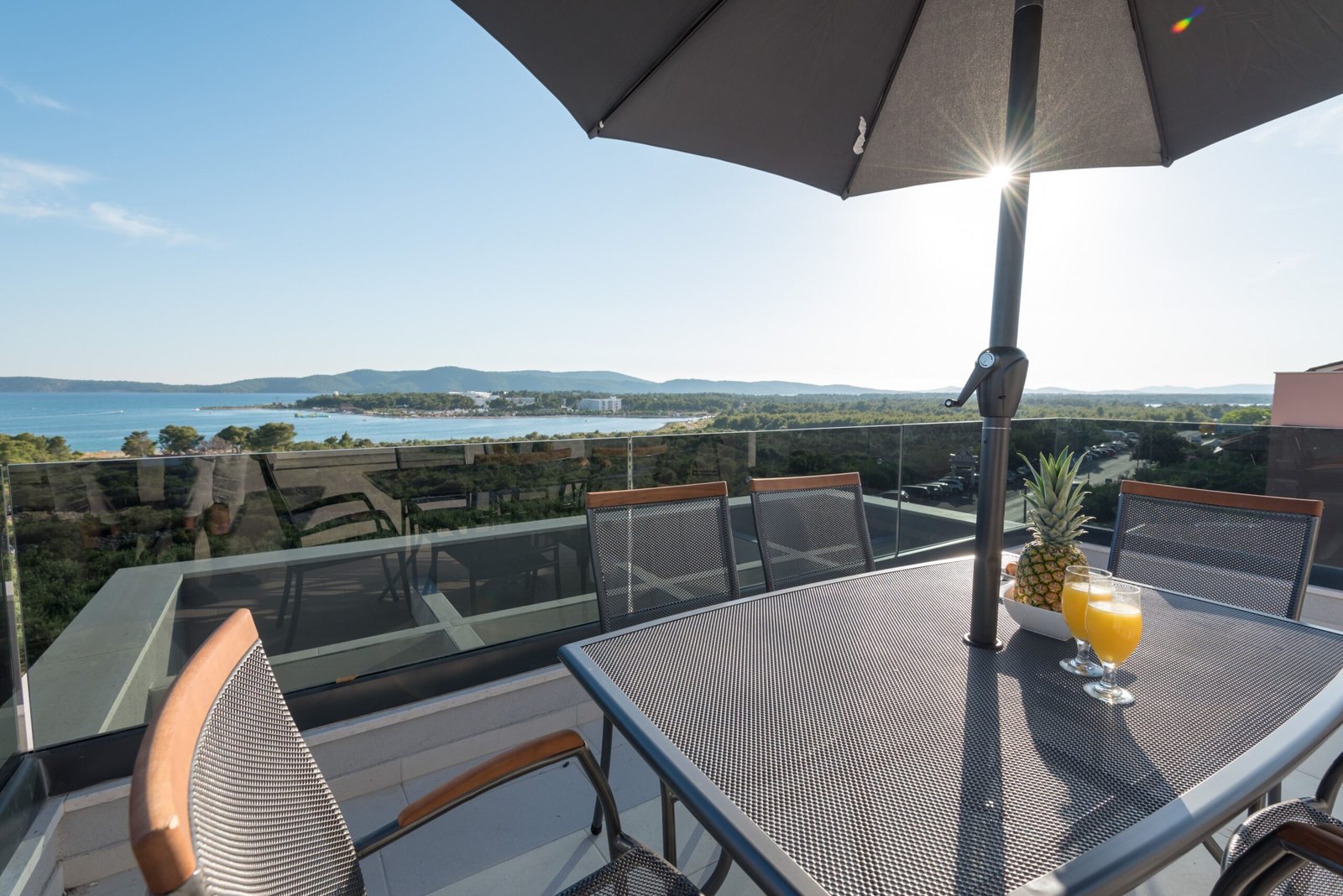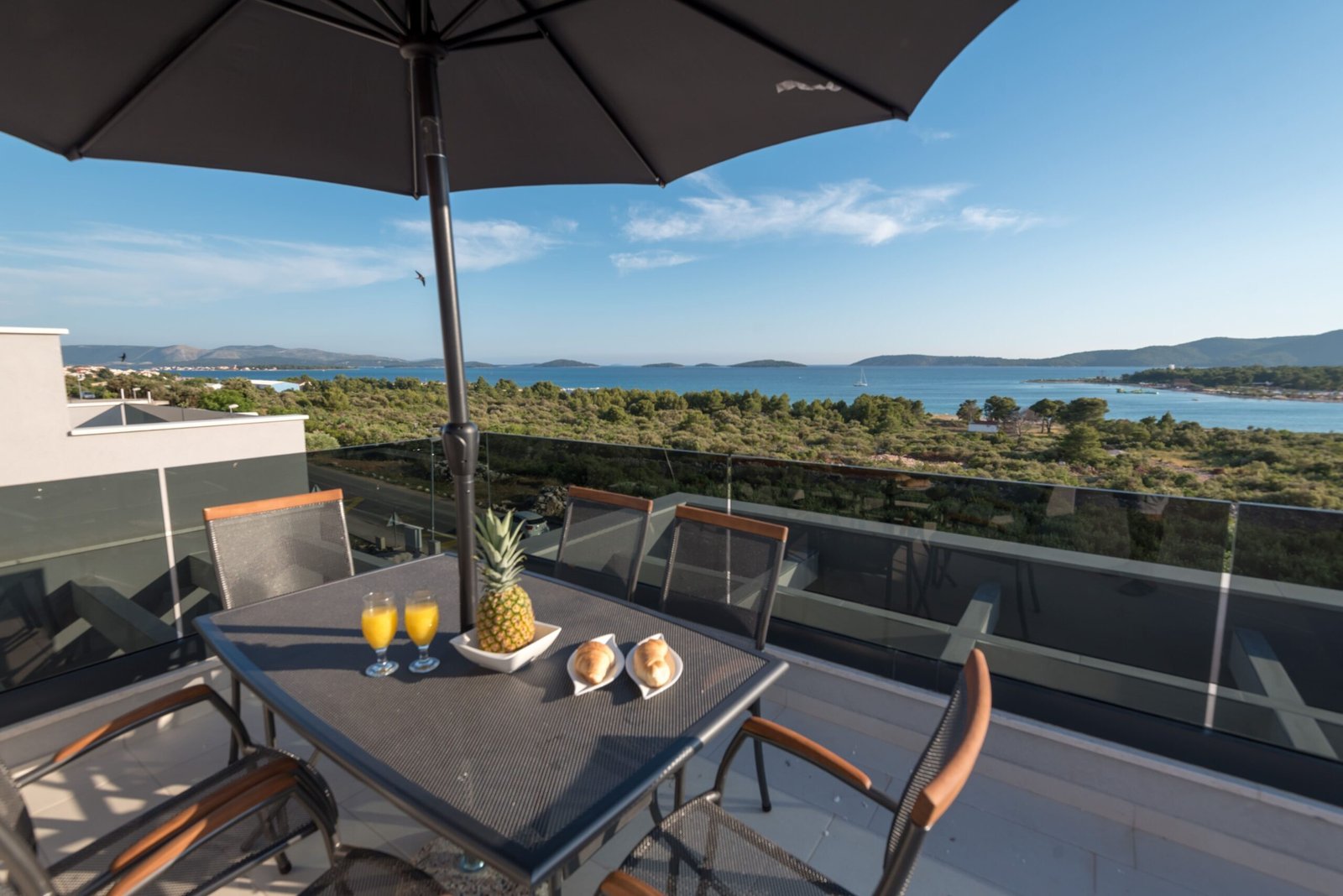 Two-bedroom apartment located on the second floor, consists of: living room with sofa bed, one bedroom with double bed, second bedroom with two single beds, a bathroom with shower, equipped kitchen and terrace with sitting area and sea view.
